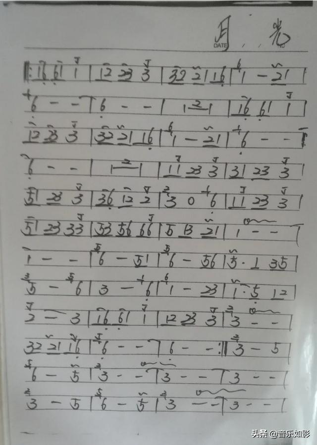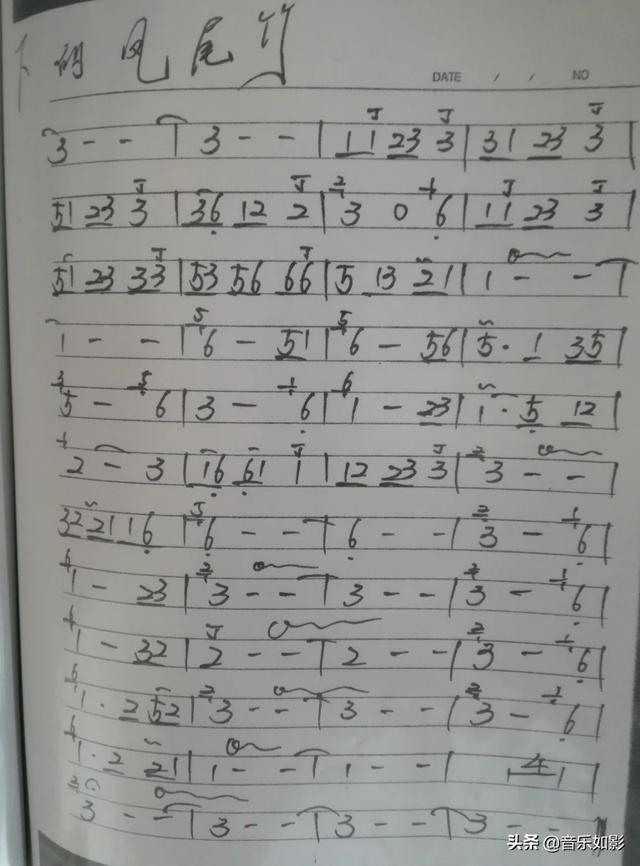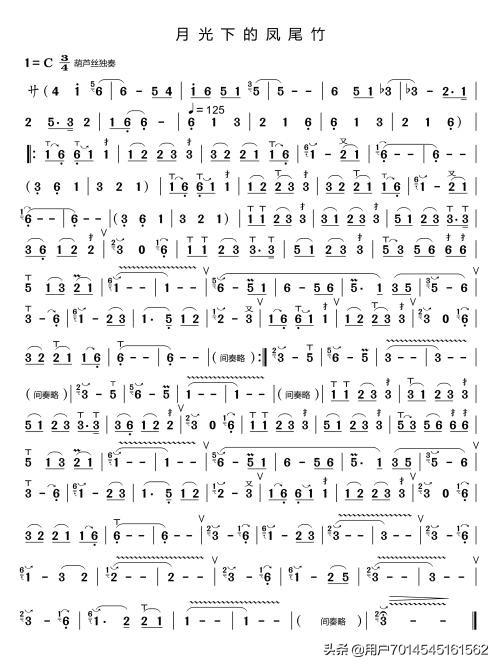 上谱的技巧符号“又”代表了叠音,是由上方音往下方音来演奏,比如:3的叠音演奏时就吹成53(只有3的叠音是上方三度音)其它音符都是上方二度音演奏,“丁”打音(这是我习惯的写法,教材里都是用“提手旁”),波浪线为颤音如:2演奏232,黑色倒三角为“断音”演奏时以很短的吐音来完成,此曲从开副管开始就需要三吐和双吐来演奏,从而达到乐曲需要的速度。(详情可以在网上查资料) 《月光下的凤尾竹