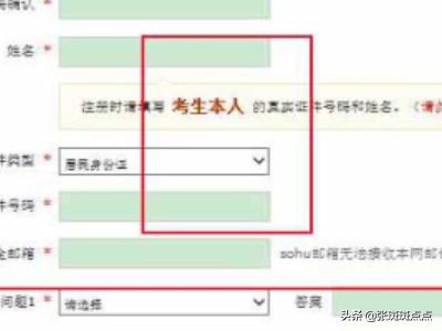 3、填写注册账号信息请一定使用考生的 身份证信息和姓名 来注册,不要使用家长本人的。密保问题三个都要填写,凡是前面带红色星号的都是必填项,一定要填写完整。